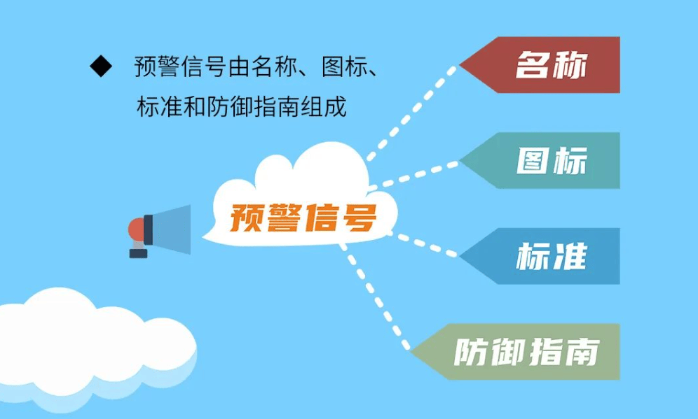 预警信号由名称、图标、标准和防御指南组成,分为蓝色、黄色、橙色和红色四个等级,分别代表一般、较重、严重和特别严重。