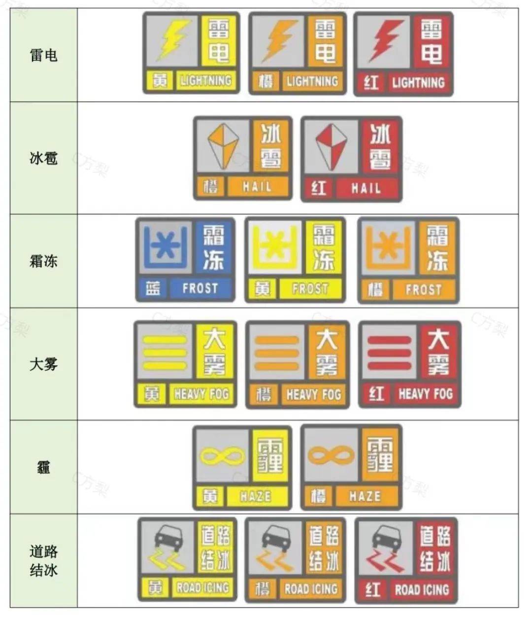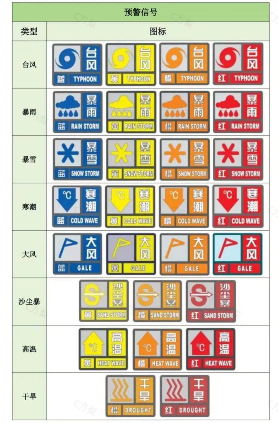 我国的气象灾害预警信号包括14类,分别是:台风、暴雨、暴雪、寒潮、大风、沙尘暴、高温、干旱、雷电、冰雹、霜冻、大雾、霾、道路结冰。不同类型的预警信号根据灾害的严重程度和紧急程度有不同的发布标准。