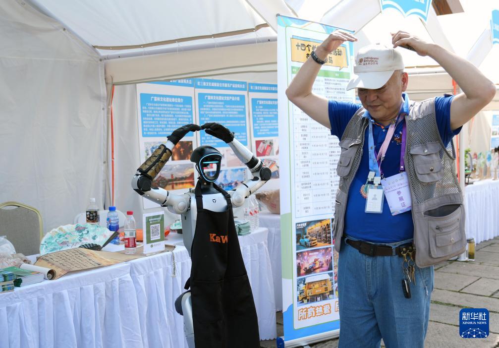9月27日,参展者与文采会现场的人形机器人互动。