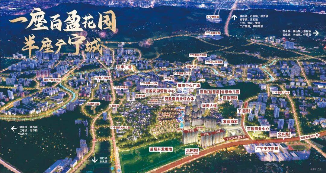◆配套方面,2009年9月,百盈广场落成开放(现城市中心广场)、2010年,百盈大道扩建升级完成、2022年9月广宁中学新校区正式立项、2023年1月北环路正式动工、2023年9月,百盈【智慧星】省级幼儿园正式开建;