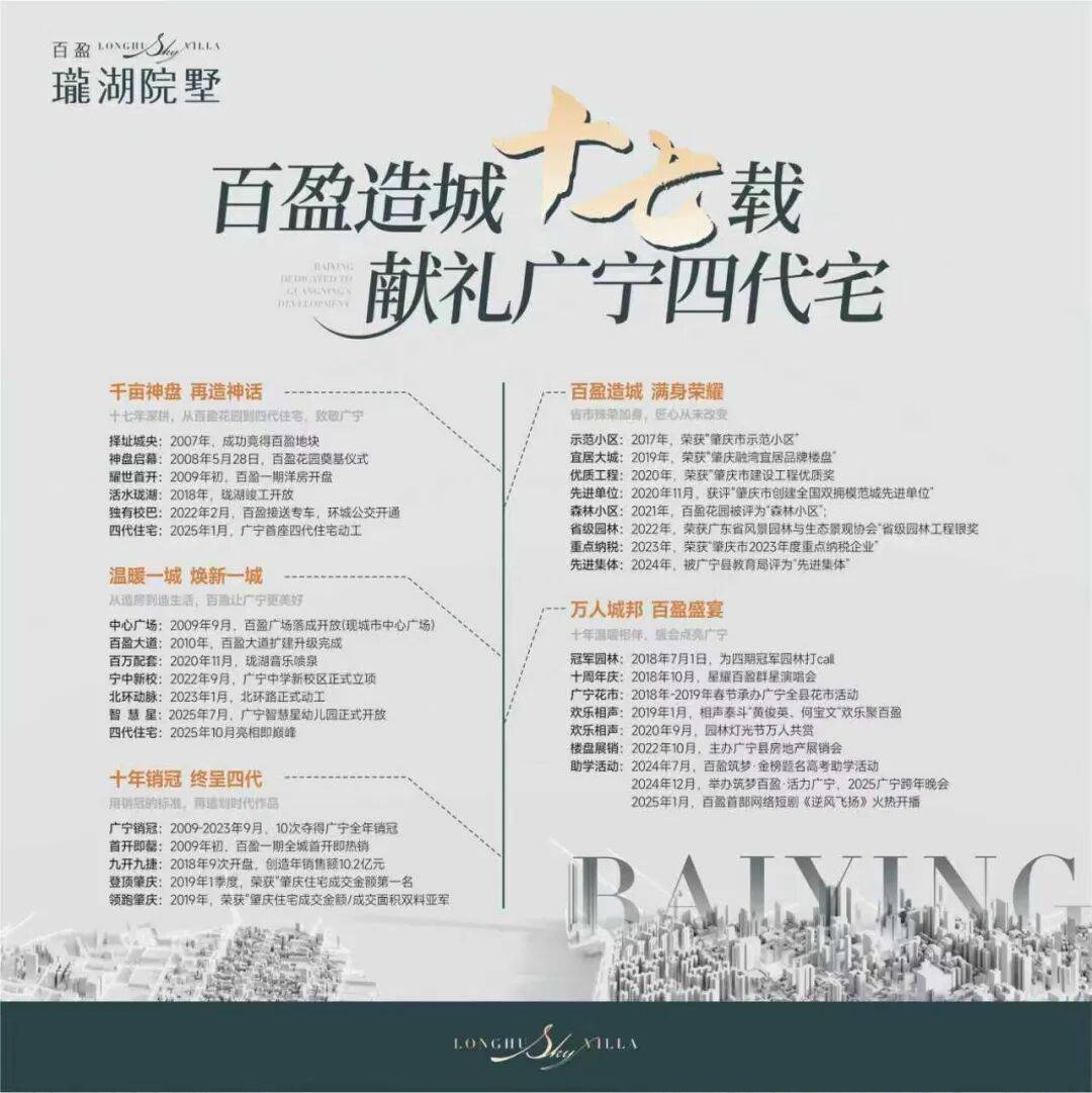 ◆开发方面,2007年,百盈择址广宁拍得城芯地块,2008年项目奠基动工,2009年一期洋房耀世首开……及后项目先后获得“10次登顶广宁年度销榜”、“一年9次开售成交破10亿”、“肇庆住宅销售面积&金额双料亚军”等傲人佳绩;
