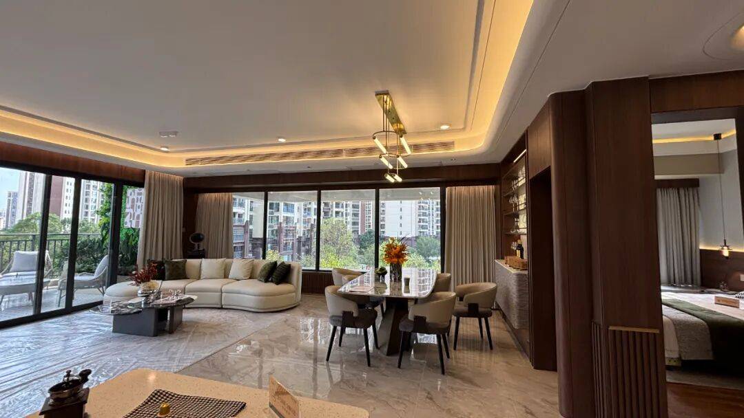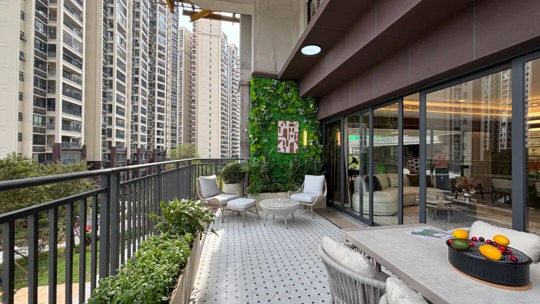 项目十分注重绿色生态与现代建筑的融合,通过垂直绿化、立体园林等设计手法,尝试在高层建筑中实现建筑与自然共生的效果,并针对传统大平层缺乏庭院空间的痛点,采用一户一庭院设计,每户配备独立的空中庭院,顺应了“好房子”关于绿色、舒适等要求。