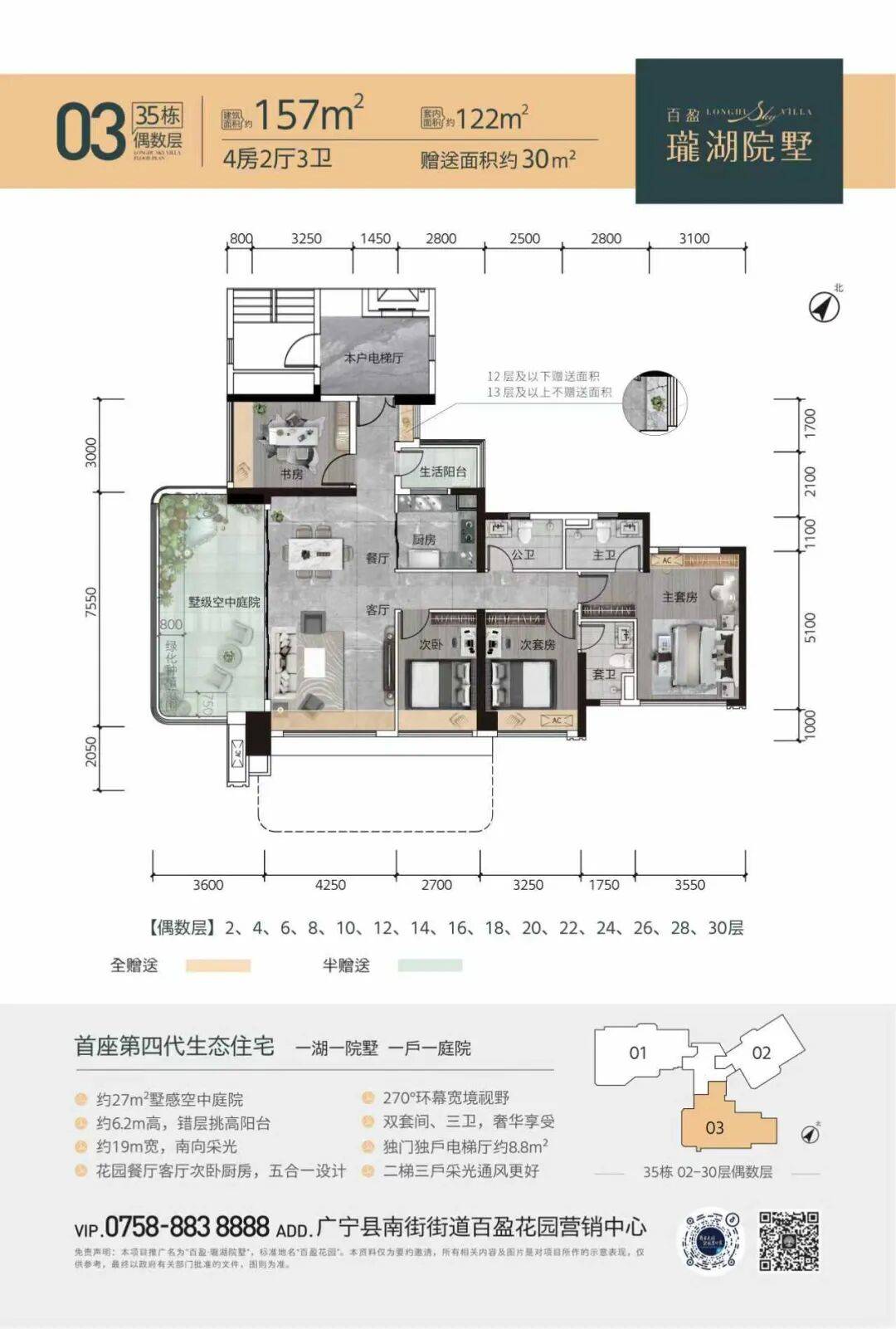 建面约179㎡,赠送面积约32㎡,4+1房2厅3卫设计。南北通透,对流双景观阳台,独门独户电梯厅约5.6㎡,双套间;约6.2米错层挑高,约37㎡空中庭院。
