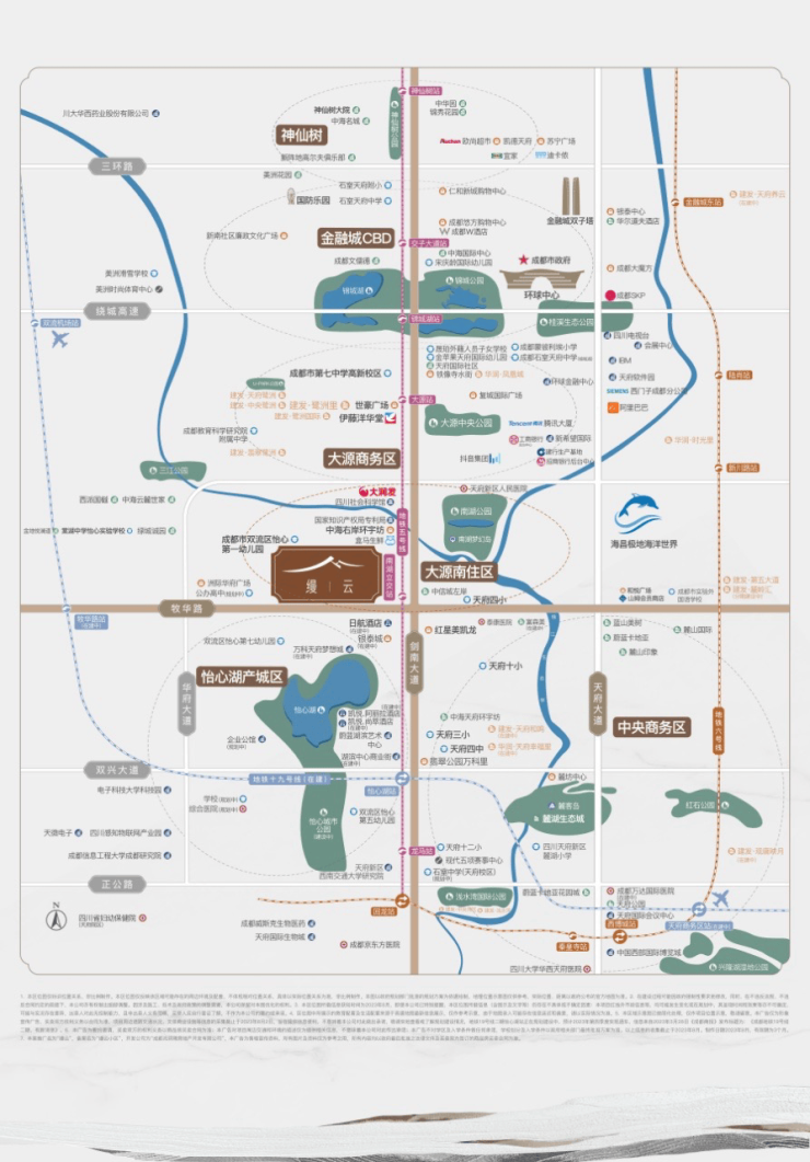 神仙树、金融城CBD、锦城湖、大源商务区、大源南住区、锦江生态带、怡心湖产城区、浅水湾等成都壕宅住区,因剑南大道而串联
